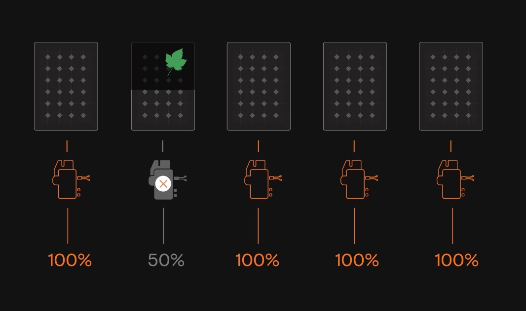 Mikro-Wechselrichter arbeiten unabhängig voneinander, sodass jedes Panel seine volle Leistung erbringt. Ein verdunkeltes oder verschmutztes Panel hat keinen Einfluss auf den Rest des Systems.